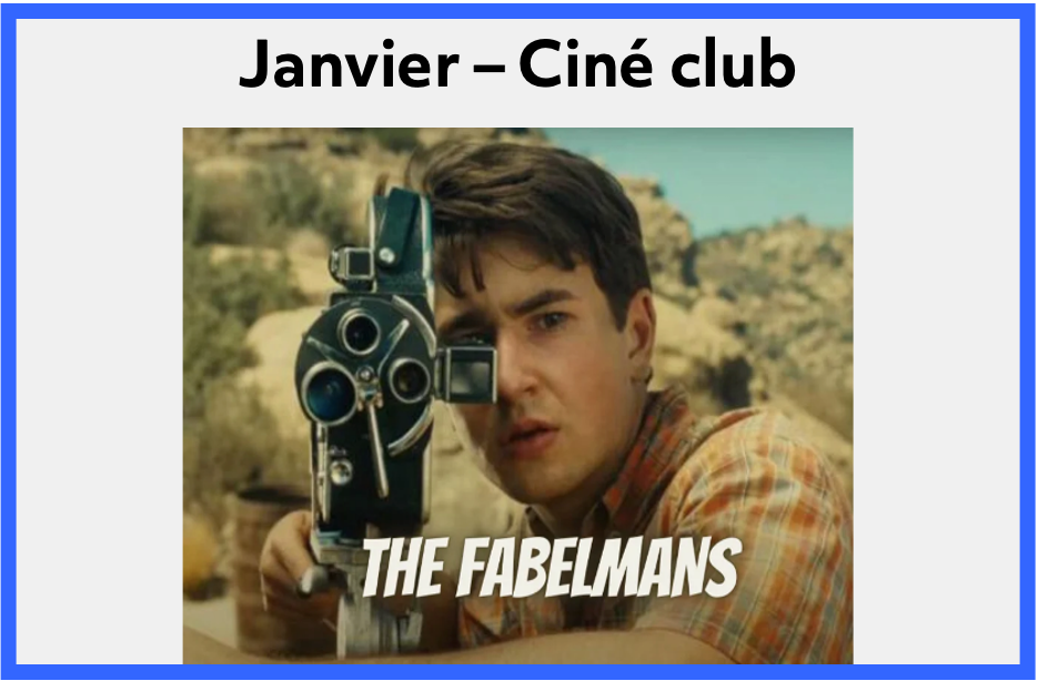 18 janvier à 13 h 25 – Sortie au cinéma pour voir Les Fabelmans au Cinéplex Odéon Quartier Latin (350 rue Émery, métro Berri-UQAM), suivi d’un échange au Resto Végo (1720, rue St-Denis). Au plaisir de vous y voir.