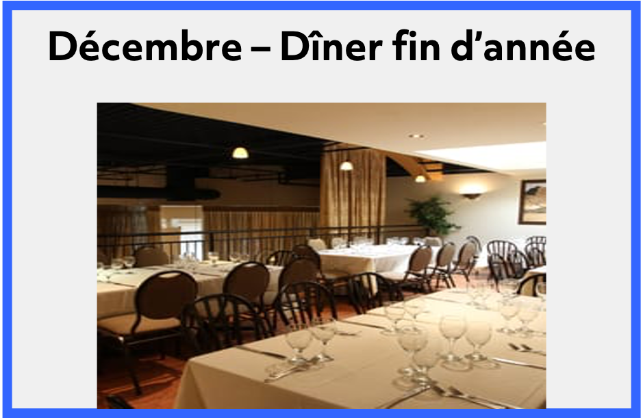 Assemblée générale annuelle le 3e jeudi de novembre. Date à confirmer.