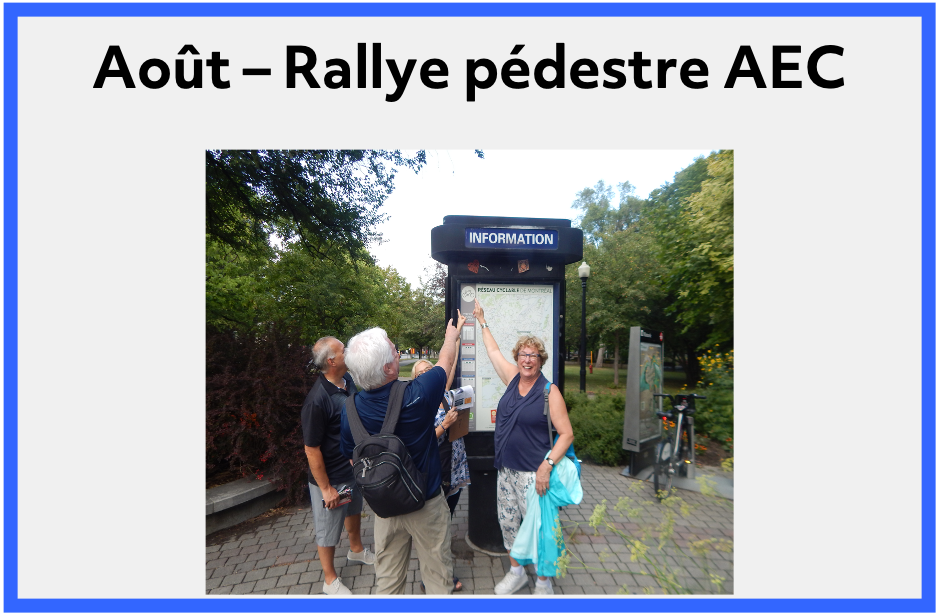 Rallye pédestre dans le vieux La Prairie, suivi du souper avec dévoilement des résultats, le dimanche 20 août. Heure, point de rencontre, restaurant et coût à déterminer.